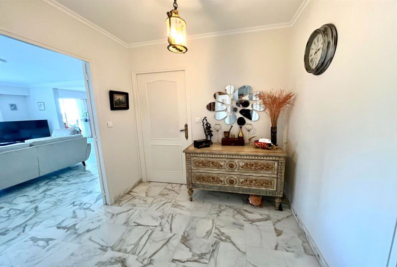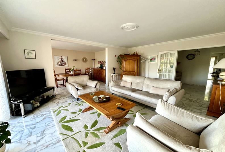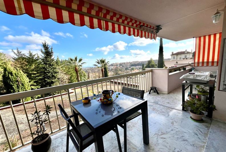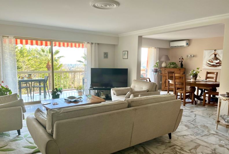 VENCE, close to the city center, beautiful unobstructed view all the way to the sea and peaceful, Spacious apartment on the raised ground floor, including entrance hall, double living room, independent equipped kitchen, two large bedrooms each with their own shower room – Italian shower/ WC, WC, dressing room, and closets. Terrace, 2 cellars, and 2 private parking spaces. - Possible to divide into 3 rooms + independent studio - - Generous spaces, high-quality finishes -