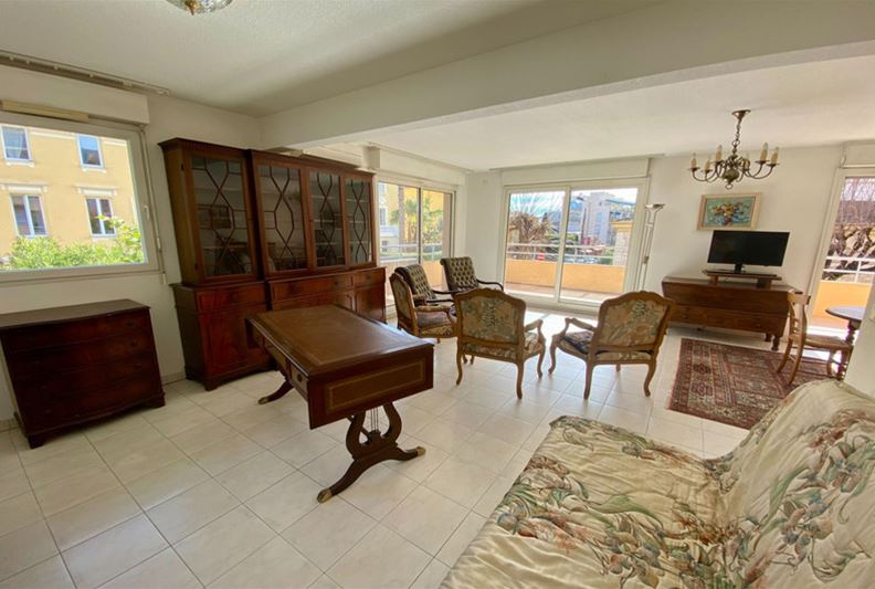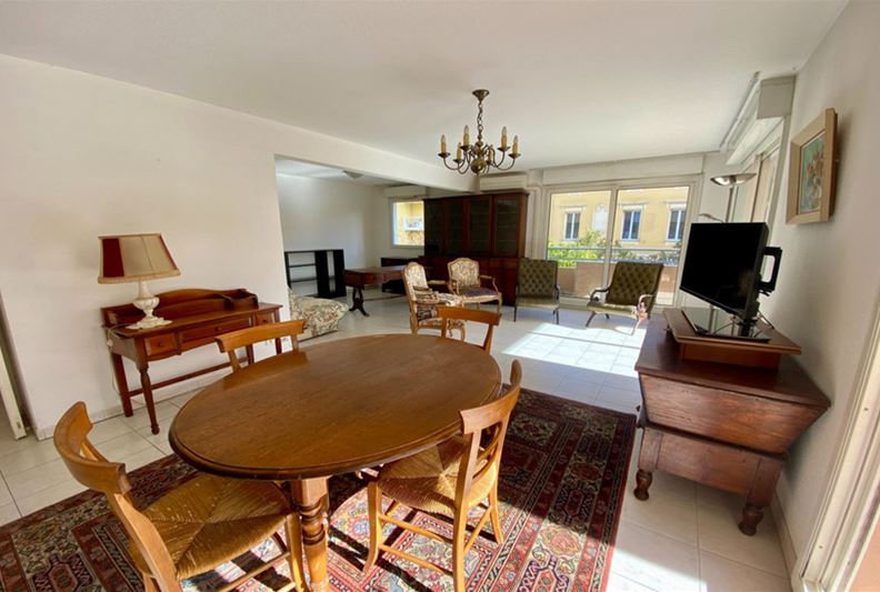 VENCE, downtown, in a high-end residence with a swimming pool, tennis courts, and a caretaker, spacious apartment comprising four main rooms converted into three: entrance, large corner double living room, separate equipped kitchen, beautiful bedroom with its own shower room/WC, and a second bedroom, bathroom, WC, and plenty of closets. Large corner terrace and double garage of 30 m².