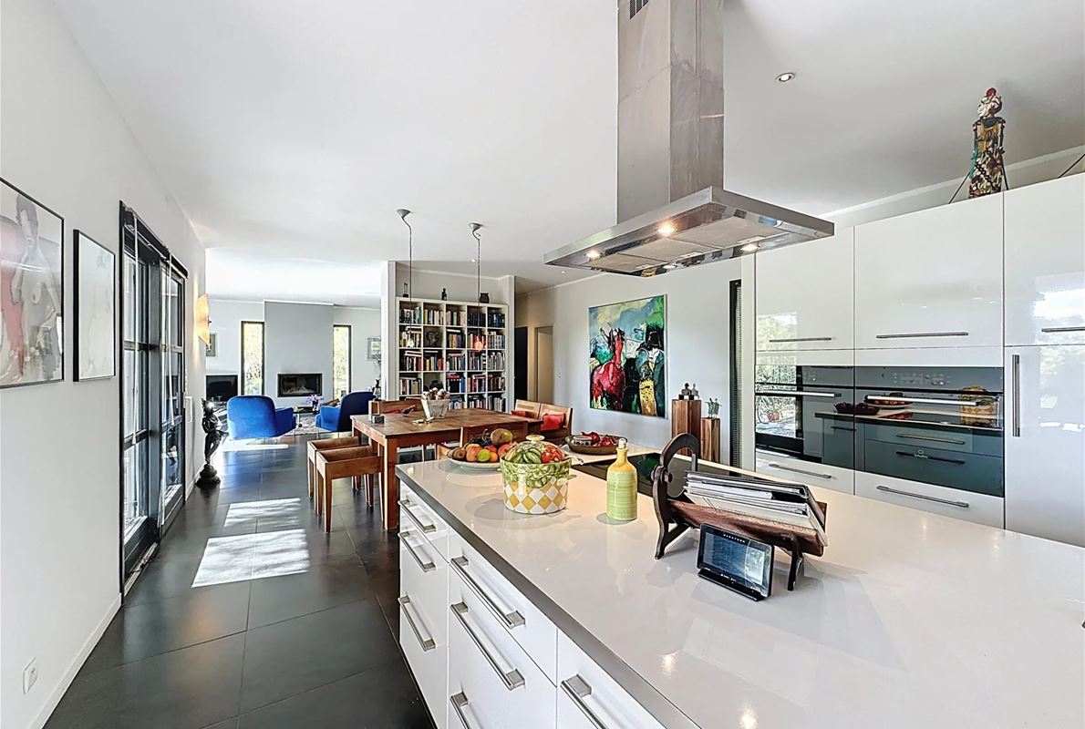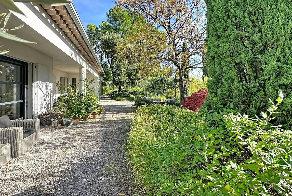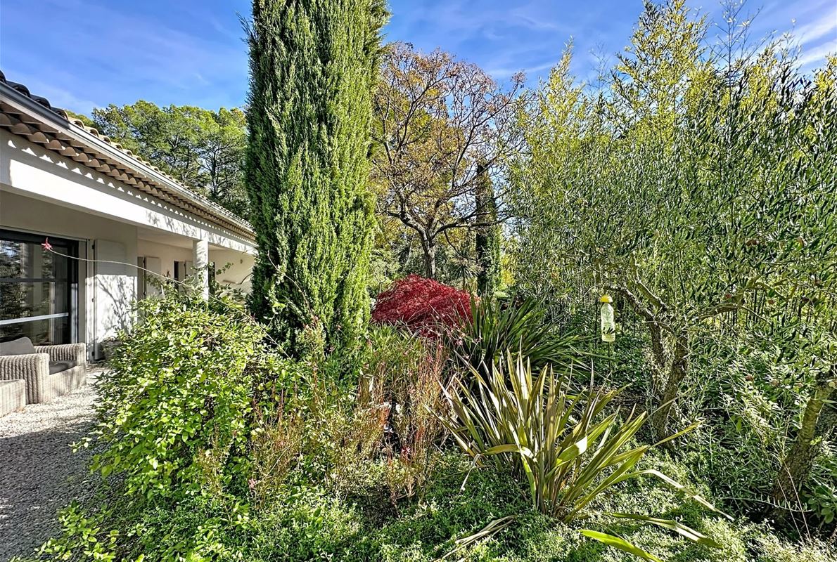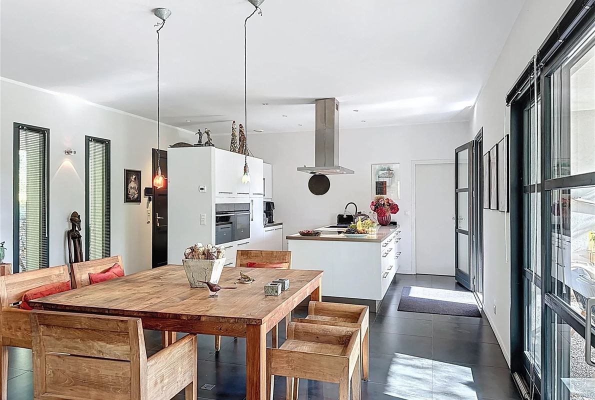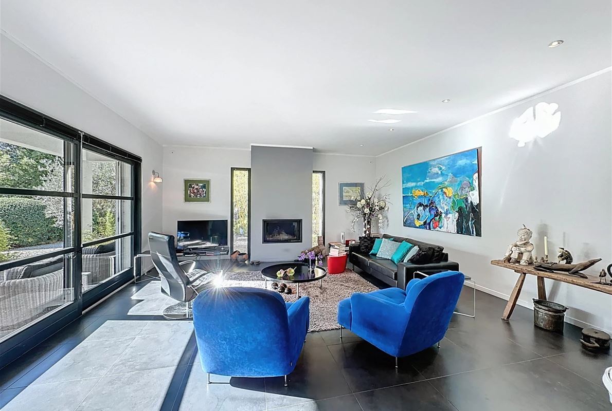 Kun få kilometer fra landsbyen ligger denne moderne og komfortable villa i ét plan. Huset er designet og bygget med omhyggelig sans for detaljer og tilbyder enestående komfort. Det har en behagelig stue, en indbydende spisestue og et fuldt udstyret åbent køkken. Store karnapvinduer åbner ud til terrasser, hvilket skaber en problemfri overgang mellem inde og ude. Den rummelige master-suite, komplet med badeværelse og påklædningsværelse, åbner ud til haven. På den anden side af huset er der yderligere to soveværelser og et badeværelse. Der er også et separat gæstetoilet, et garderoberum, en stor tilhørende garage og en dobbelt carport.