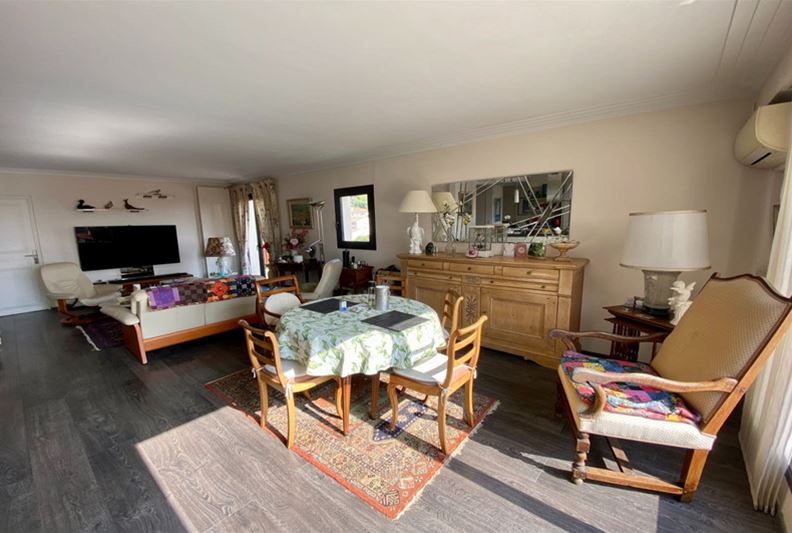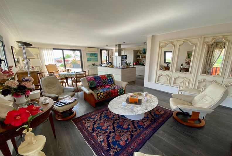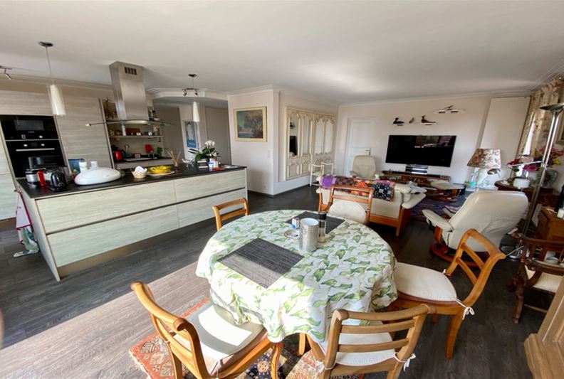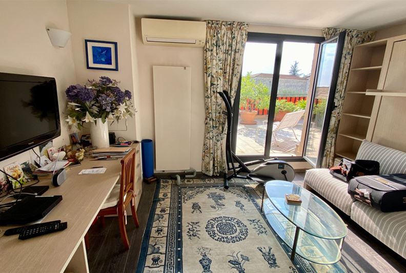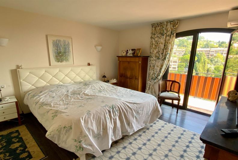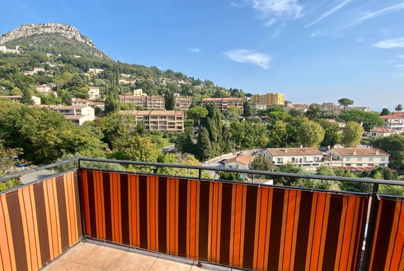 Nær centrum af Vence, med smuk uhindret udsigt over bakkerne og den historiske by, Fantastisk lejlighed på øverste etage i villastil, bestående af en entré med indbyggede skabe, separat toilet, rummelig stue med åbent køkken, soveværelse med indbyggede skabe, brusebadeværelse og toilet, et andet soveværelse med indbyggede skabe og et kontor eller tredje soveværelse med indbyggede skabe og brusebadeværelse. Stor, delvist overdækket terrasse med sommerkøkken, to altaner, kælder og privat udendørs parkering. Garage tilgængelig mod et ekstra betaling.