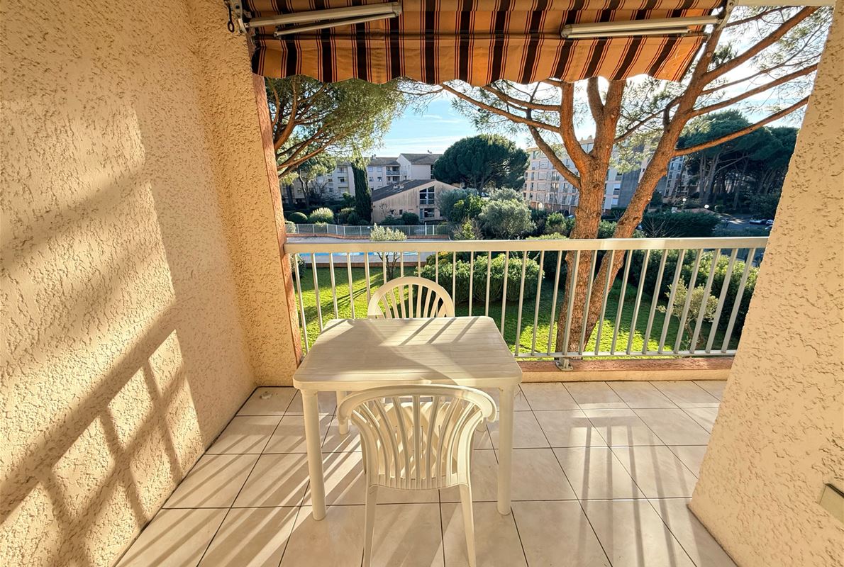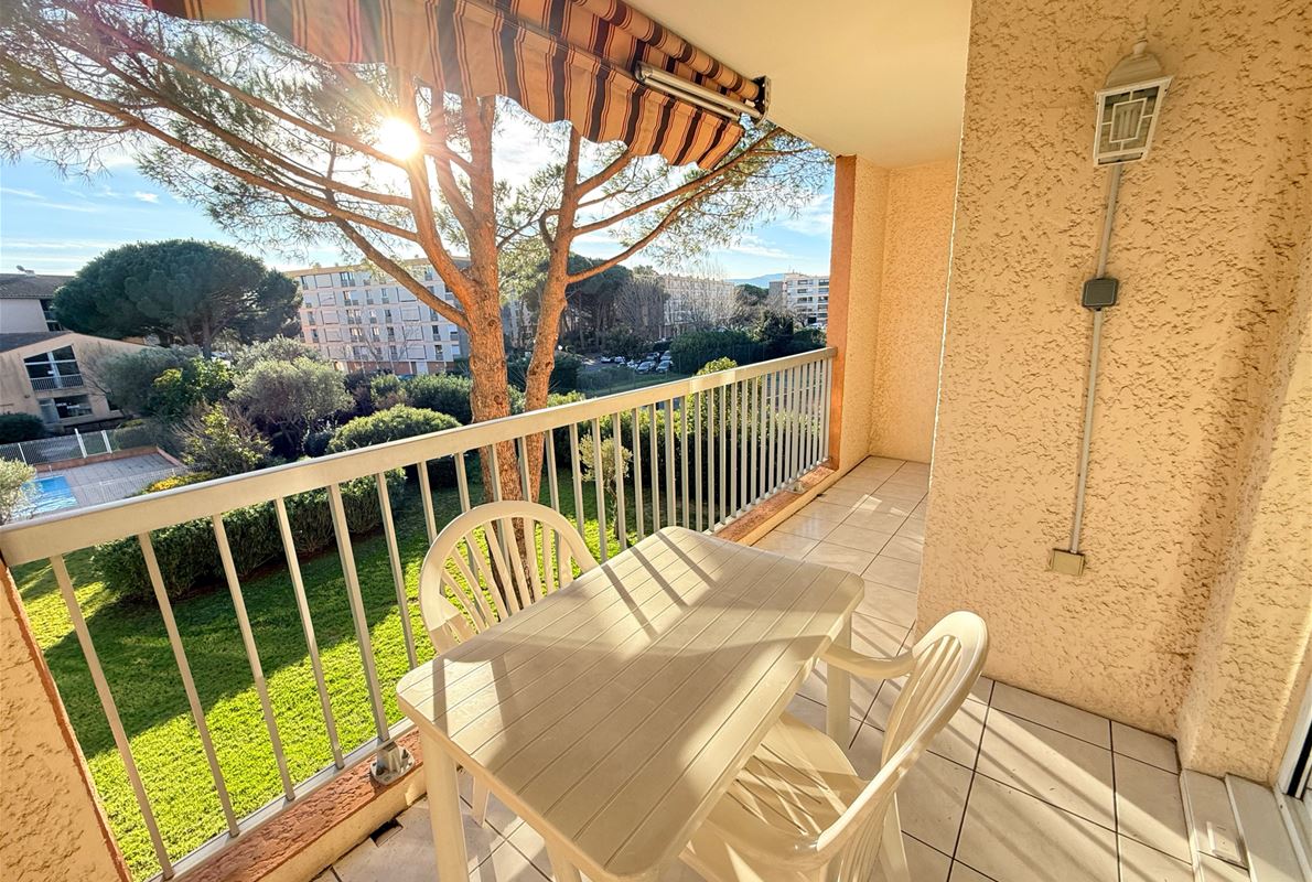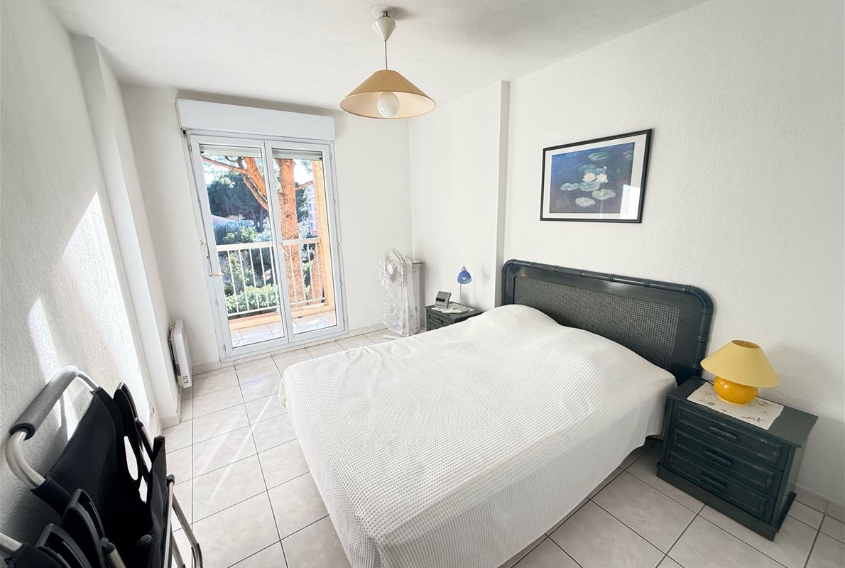 In a secure residence with tennis court and swimming pool, a two-room apartment of approximately 45.42m² comprising an entrance hall, a separate WC, a living room with built-in wardrobe, a separate fitted kitchen, a sleeping area with built-in wardrobe, a bathroom with built-in wardrobe, and a bedroom with built-in wardrobe. South-facing terrace. Cellar. Private parking space. Garage available at an additional cost (€25,000).