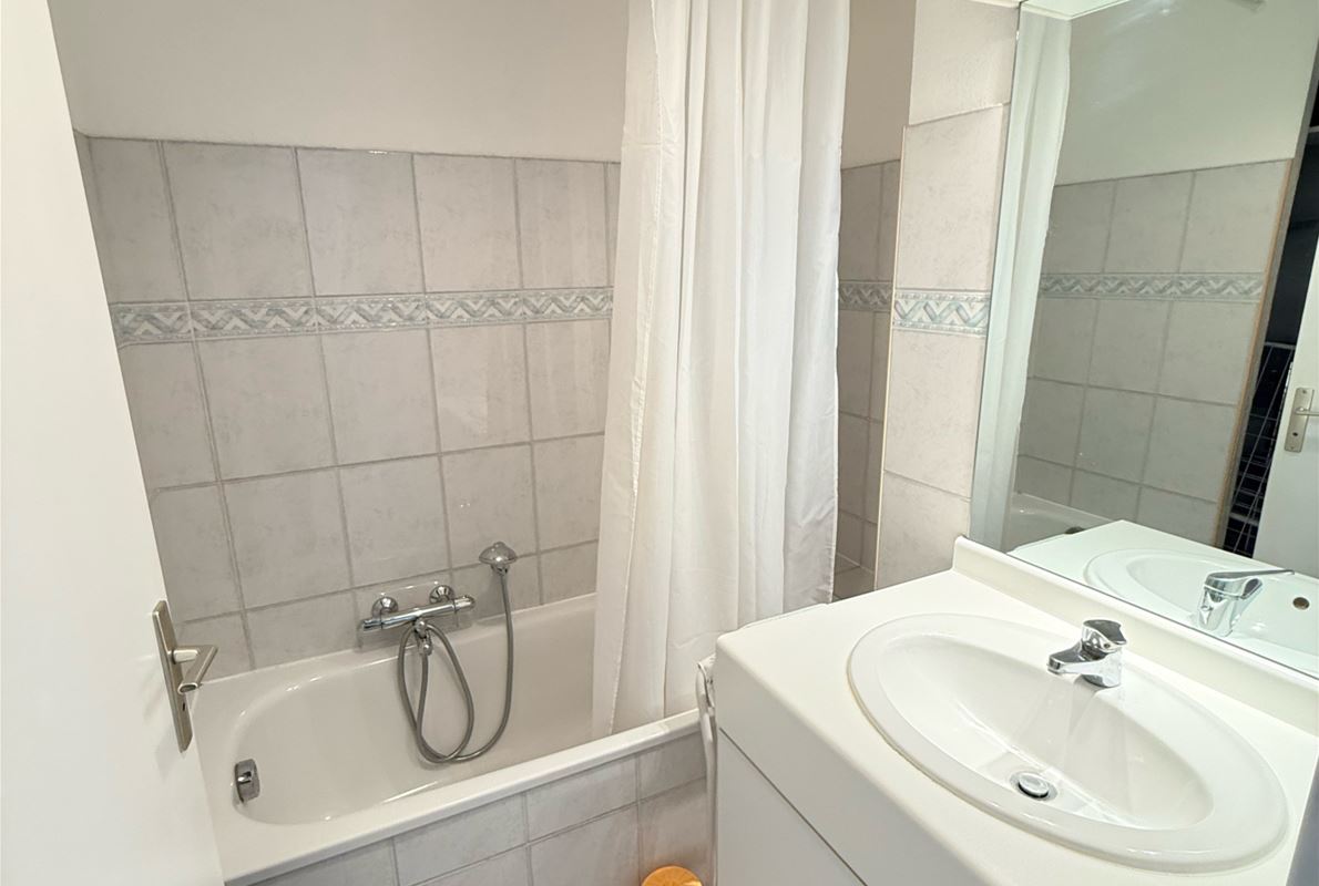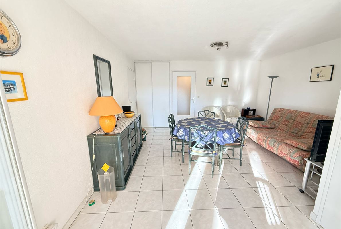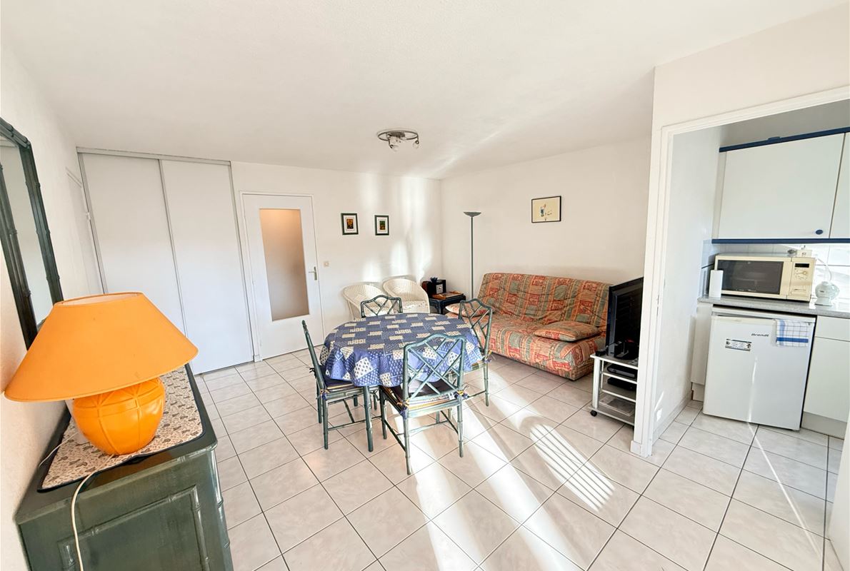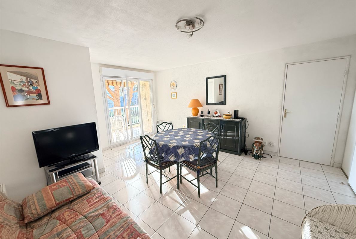 In a secure residence with tennis court and swimming pool, a two-room apartment of approximately 45.42m² comprising an entrance hall, a separate WC, a living room with built-in wardrobe, a separate fitted kitchen, a sleeping area with built-in wardrobe, a bathroom with built-in wardrobe, and a bedroom with built-in wardrobe. South-facing terrace. Cellar. Private parking space. Garage available at an additional cost (€25,000).